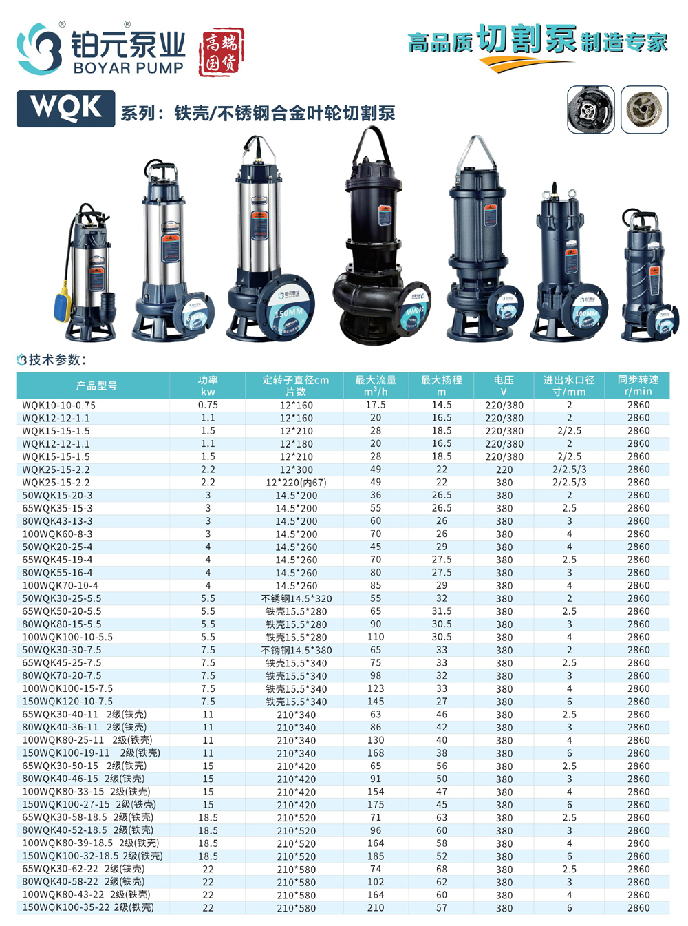 产品名称:WQK系列铁壳/不锈钢合金叶轮切割泵